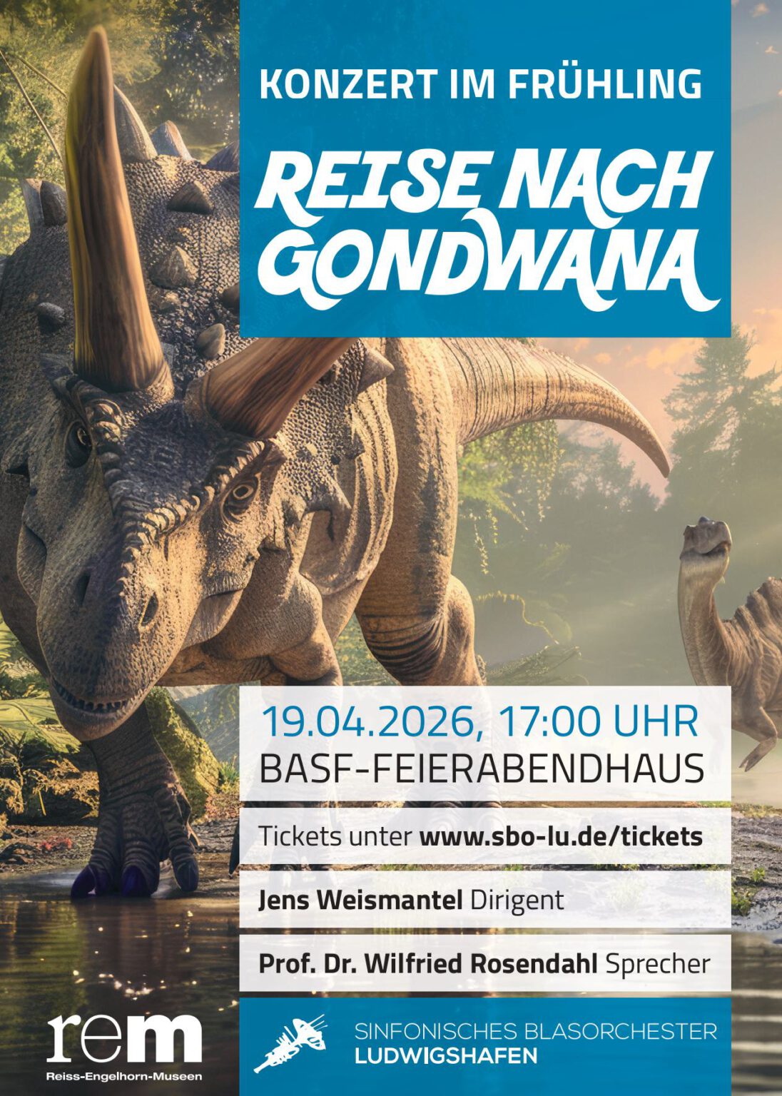 Mit einer Reise nach Gondwana lädt das Sinfonische Blasorchester Ludwigshafen zu einer Zeitreise in die Urzeit ein. Im BASF-Feierabendhaus spannt das Konzert am Sonntag, 19. April um 17.00 Uhr einen Bogen zwischen sinfonischer Bläsermusik und eindrucksvollen Projektionen des Kosmos und prähistorischer Landschaften.