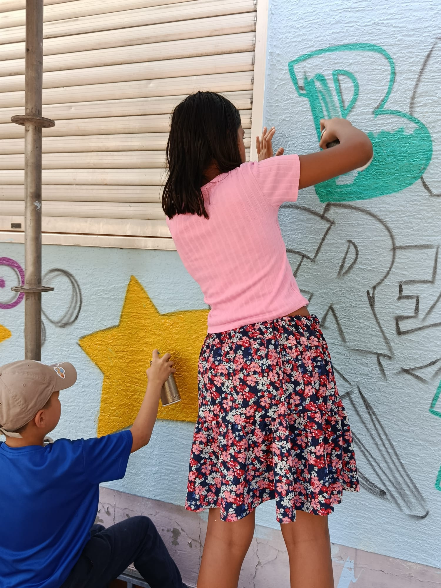 Im Anschluss an die Fassadenarbeiten folgte ein Graffiti-Projekt , an dem zehn Kinder im Alter zwischen 7 und 14 Jahren teilnahmen. Unter Anleitung eines Künstler-Duos sowie begleitet durch Mitarbeiterinnen des Jugendzentrums entwickelten die Kinder eigene Gestaltungsideen und lernten verschiedene Graffiti-Techniken kennen. Die künstlerischen Elemente wurden anschließend gemeinsam auf die frisch gestrichene Fassade aufgebracht und verleihen dem Gebäude nun einen lebendigen und individuellen Charakter.