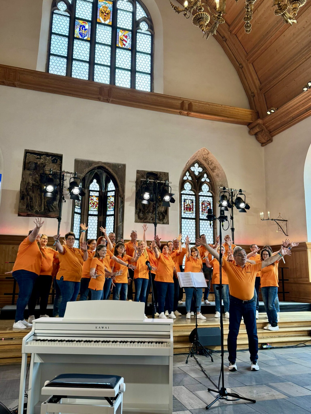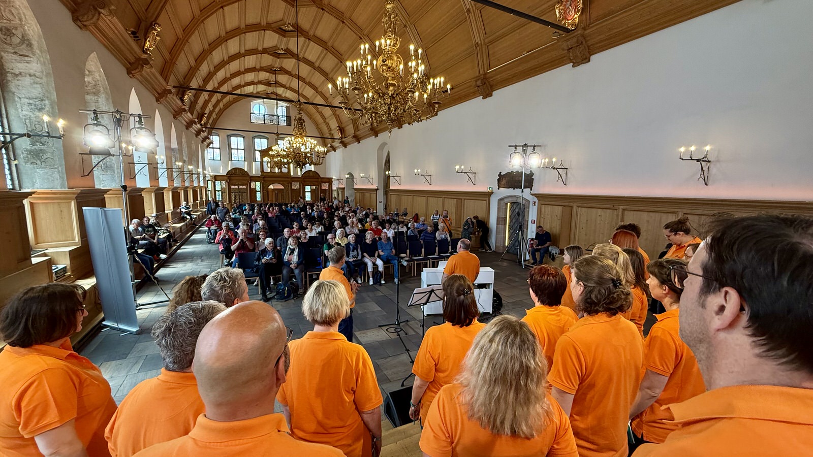 Unser musikalischer Auftritt fand im prachtvollen Festsaal des Alten Rathauses statt. In auffälligen orangefarbenen Poloshirts präsentierten wir ein vielseitiges und klangstarkes Programm – von stimmungsvollen Balladen wie „La Montanara“ bis hin zu mitreißenden Pop-Songs wie „One of Those Songs“. Die hohe Wiedererkennbarkeit durch unsere Signalfarbe führte bereits auf den Gängen zu vielen positiven Begegnungen und netten Gesprächen mit Zuhörern. Eine Besucherin beschrieb treffend: