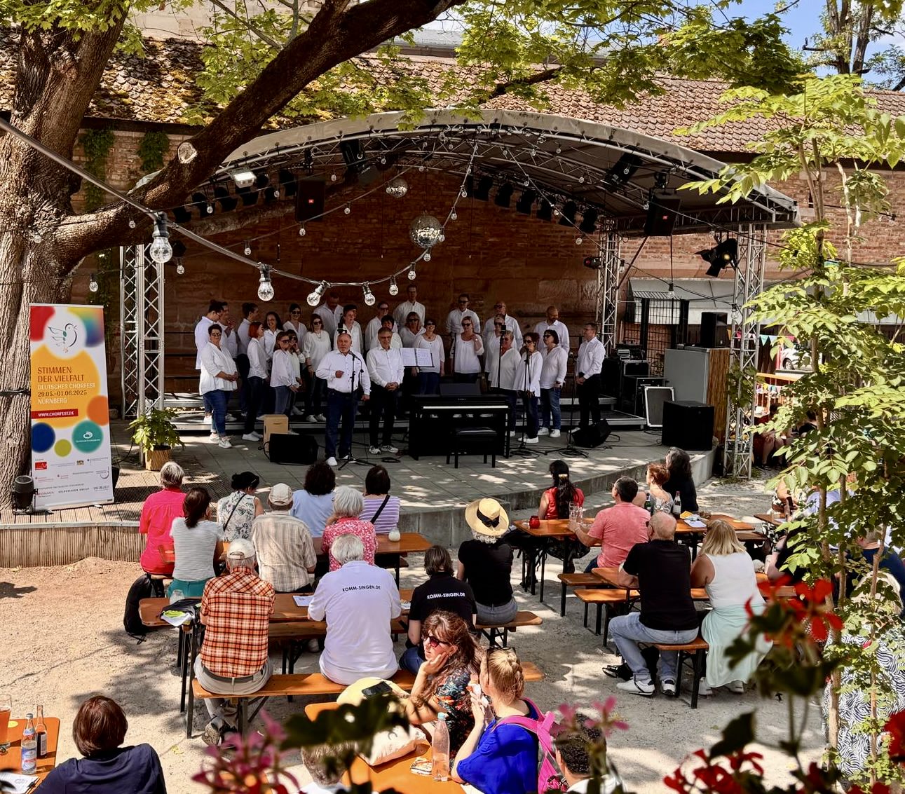 Zum Abschluss sangen wir bei 29 °C im Schatten im Garten des Künstlerhauses im Rahmen der Bühne „Stimmen der Vielfalt“. Die sommerliche Atmosphäre und laue Luft schufen einen inspirierenden Rahmen. Sopranistin Betti meinte: